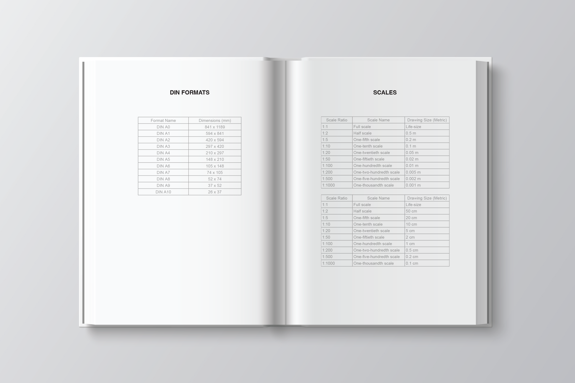 - Integrated Design Tools: This includes an ISO 216 paper-size table, a scale table, scale paper, hatching techniques, and people and tree representations.